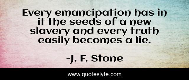 This page presents the quote "Every emancipation has in it the seeds of a new slavery and every truth easily becomes a lie.". Author of this quote is J. F. Stone. .