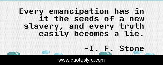 This page presents the quote "Every emancipation has in it the seeds of a new slavery, and every truth easily becomes a lie.". Author of this quote is I. F. Stone. This quote is about lie, slavery, new,.