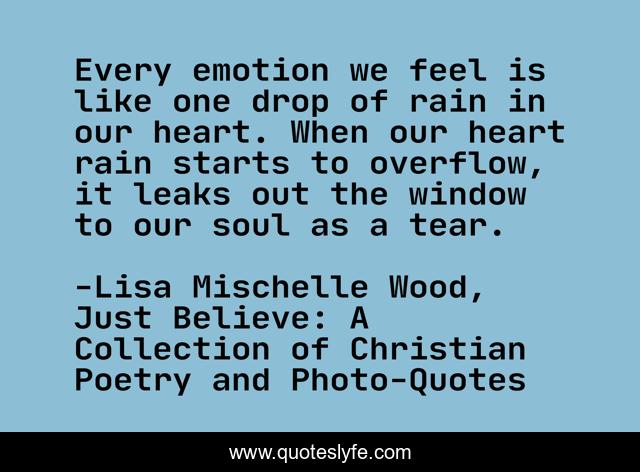 This page presents the quote "Every emotion we feel is like one drop of rain in our heart. When our heart rain starts to overflow, it leaks out the window to our soul as a tear.". Author of this quote is Lisa Mischelle Wood, Just Believe: A Collection of Christian Poetry and Photo-Quotes. This quote is about heart, tears, soul, emotions,.