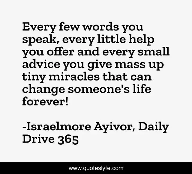 This page presents the quote "Every few words you speak, every little help you offer and every small advice you give mass up tiny miracles that can change someone's life forever!". Author of this quote is Israelmore Ayivor, Daily Drive 365. This quote is about miracles, mini, food-for-thought, inspirations, few-words, help, communication, advice, communicate,.
