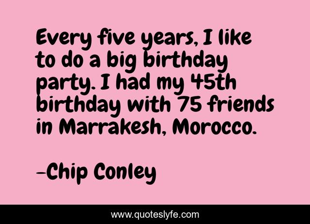 This page presents the quote "Every five years, I like to do a big birthday party. I had my 45th birthday with 75 friends in Marrakesh, Morocco.". Author of this quote is Chip Conley. This quote is about party, friends, years,.