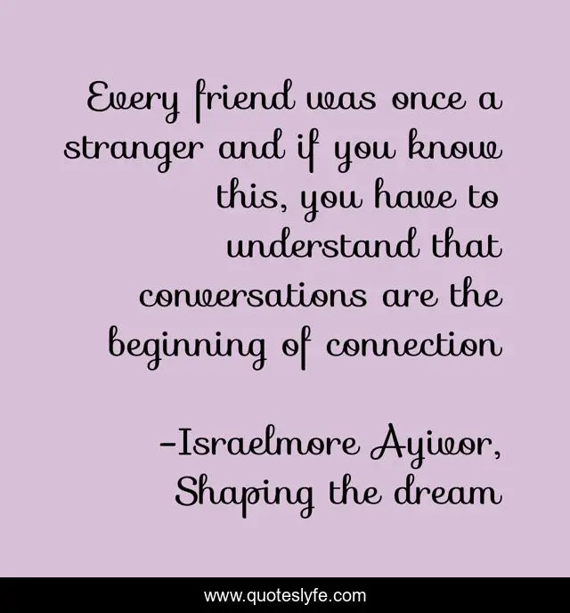 This page presents the quote "Every friend was once a stranger and if you know this, you have to understand that conversations are the beginning of connection". Author of this quote is Israelmore Ayivor, Shaping the dream. This quote is about chats, begin, beginning, stranger, relationship, people, new-people, converse, friends,.