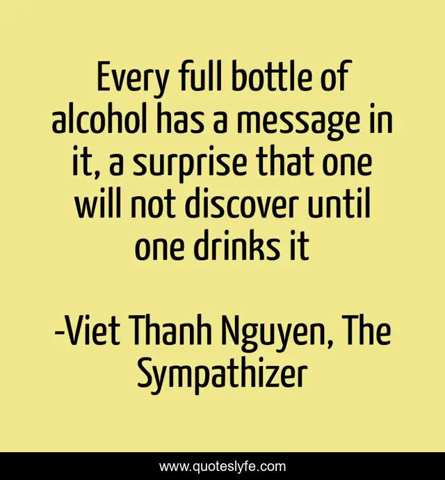 This page presents the quote "Every full bottle of alcohol has a message in it, a surprise that one will not discover until one drinks it". Author of this quote is Viet Thanh Nguyen, The Sympathizer. .