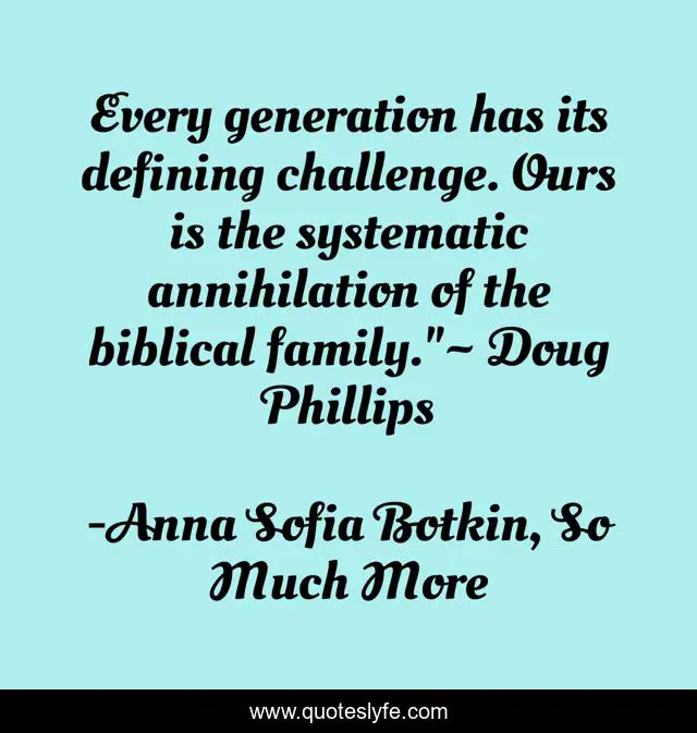 This page presents the quote "Every generation has its defining challenge. Ours is the systematic annihilation of the biblical family."~ Doug Phillips". Author of this quote is Anna Sofia Botkin, So Much More. This quote is about family-roles, biblical, family,.