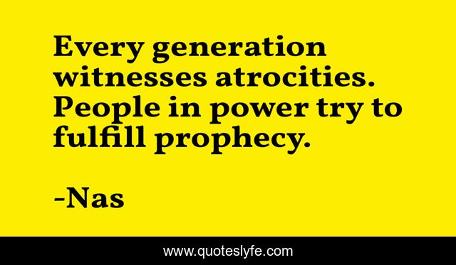 This page presents the quote "Every generation witnesses atrocities. People in power try to fulfill prophecy.". Author of this quote is Nas. This quote is about generation, try, people,.