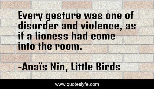 This page presents the quote "Every gesture was one of disorder and violence, as if a lioness had come into the room.". Author of this quote is Anaïs Nin, Little Birds. This quote is about lioness, anaïs-nin, erotica, disorder, gesture, femme,.