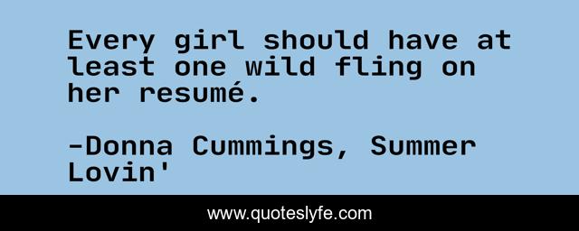 This page presents the quote "Every girl should have at least one wild fling on her resumé.". Author of this quote is Donna Cummings, Summer Lovin'. This quote is about romance, romantic-comedy, novella,.