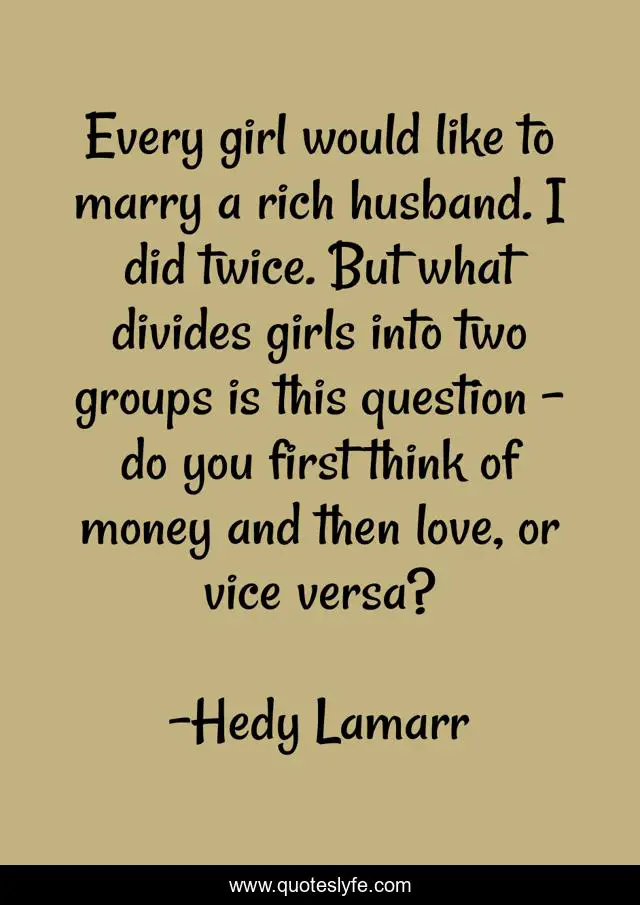 This page presents the quote "Every girl would like to marry a rich husband. I did twice. But what divides girls into two groups is this question - do you first think of money and then love, or vice versa?". Author of this quote is Hedy Lamarr. This quote is about money, marriage,.