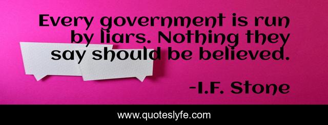 This page presents the quote "Every government is run by liars. Nothing they say should be believed.". Author of this quote is I.F. Stone. This quote is about politics, government,.