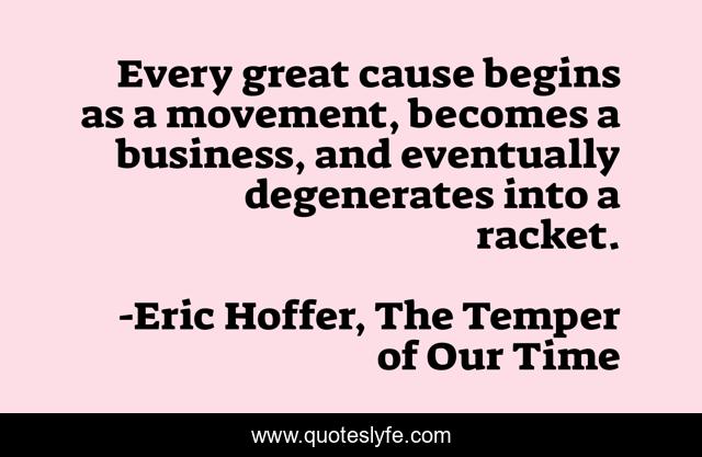This page presents the quote "Every great cause begins as a movement, becomes a business, and eventually degenerates into a racket.". Author of this quote is Eric Hoffer, The Temper of Our Time. This quote is about politics, philosophy, belief, movements,.