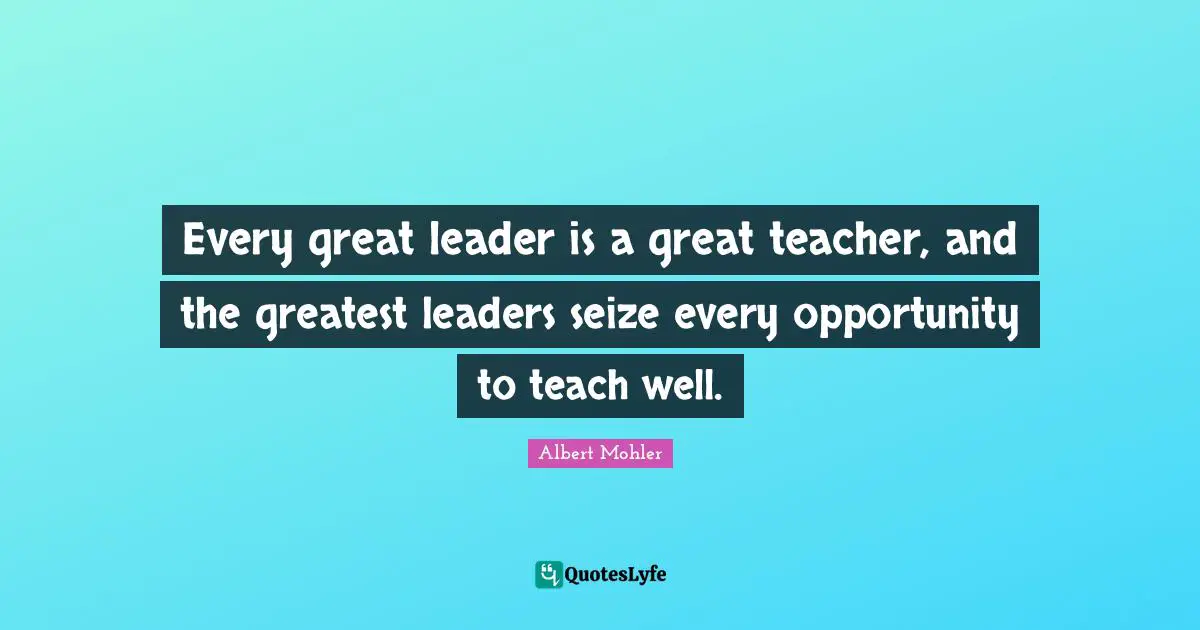 This page presents the quote "Every great leader is a great teacher, and the greatest leaders seize every opportunity to teach well.". Author of this quote is Albert Mohler. This quote is about leader, great teacher, teacher, great leader, teach, opportunity,.