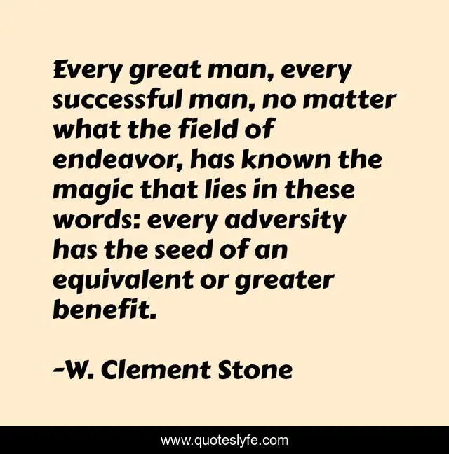 This page presents the quote "Every great man, every successful man, no matter what the field of endeavor, has known the magic that lies in these words: every adversity has the seed of an equivalent or greater benefit.". Author of this quote is W. Clement Stone. This quote is about hardship, problems, behaviour, attitude, persistence, adversity,.