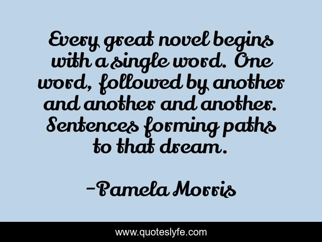 This page presents the quote "Every great novel begins with a single word. One word, followed by another and another and another. Sentences forming paths to that dream.". Author of this quote is Pamela Morris. This quote is about paths, novel, dreams, writing,.