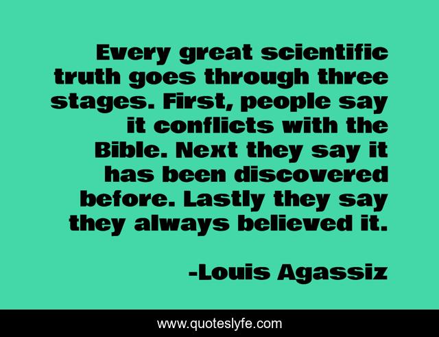This page presents the quote "Every great scientific truth goes through three stages. First, people say it conflicts with the Bible. Next they say it has been discovered before. Lastly they say they always believed it.". Author of this quote is Louis Agassiz. This quote is about scientific-truth, science, science-and-religion, bible, fact, truth, the-bible, facts, conflict,.