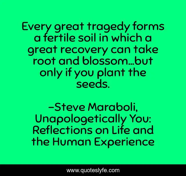 This page presents the quote "Every great tragedy forms a fertile soil in which a great recovery can take root and blossom...but only if you plant the seeds.". Author of this quote is Steve Maraboli, Unapologetically You: Reflections on Life and the Human Experience. This quote is about plant, recovery, success, blossom, fertile-soil, seeds, tragedy,.