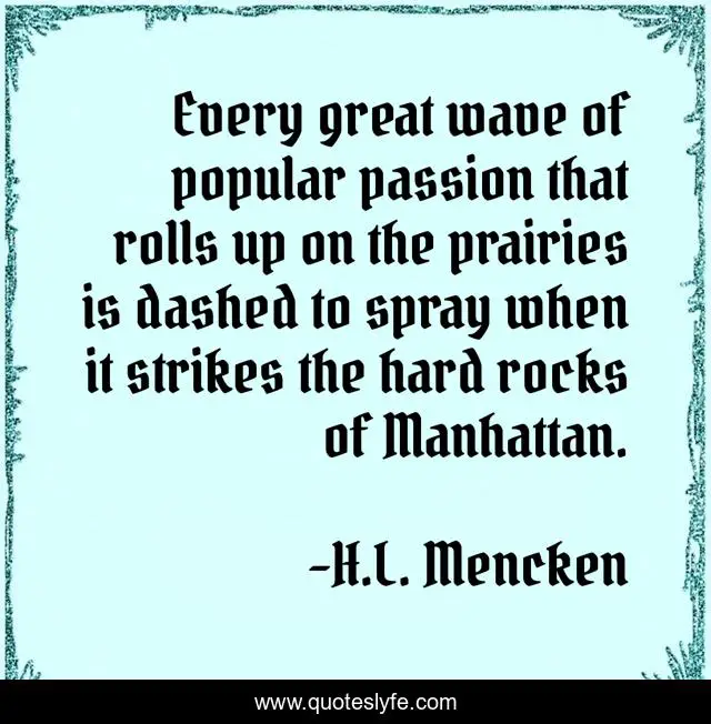 This page presents the quote "Every great wave of popular passion that rolls up on the prairies is dashed to spray when it strikes the hard rocks of Manhattan.". Author of this quote is H.L. Mencken. .