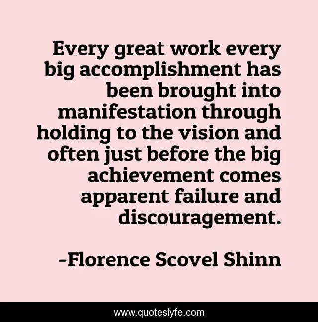 This page presents the quote "Every great work every big accomplishment has been brought into manifestation through holding to the vision and often just before the big achievement comes apparent failure and discouragement.". Author of this quote is Florence Scovel Shinn. This quote is about , pressure, diamonds,.