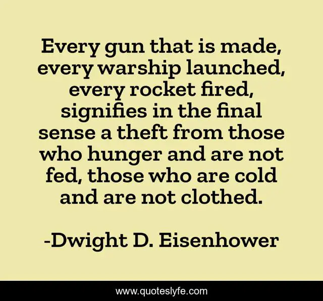This page presents the quote "Every gun that is made, every warship launched, every rocket fired, signifies in the final sense a theft from those who hunger and are not fed, those who are cold and are not clothed.". Author of this quote is Dwight D. Eisenhower. .