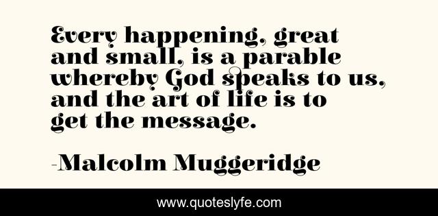 This page presents the quote "Every happening, great and small, is a parable whereby God speaks to us, and the art of life is to get the message.". Author of this quote is Malcolm Muggeridge. This quote is about god, life, great,.