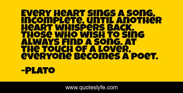 This page presents the quote "Every heart sings a song, incomplete, until another heart whispers back. Those who wish to sing always find a song. At the touch of a lover, everyone becomes a poet.". Author of this quote is Plato. This quote is about love, poetry, affection, song,.