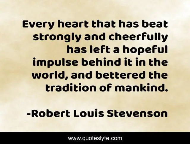 This page presents the quote "Every heart that has beat strongly and cheerfully has left a hopeful impulse behind it in the world, and bettered the tradition of mankind.". Author of this quote is Robert Louis Stevenson. This quote is about heart, tradition, world,.