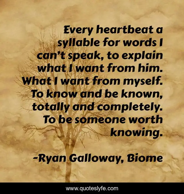 This page presents the quote "Every heartbeat a syllable for words I can’t speak, to explain what I want from him. What I want from myself. To know and be known, totally and completely. To be someone worth knowing.". Author of this quote is Ryan Galloway, Biome. This quote is about connection, knowing-others, knowing-oneself, self-expression, understanding,.