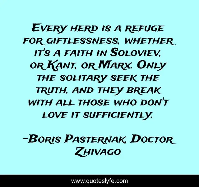 This page presents the quote "Every herd is a refuge for giftlessness, whether it's a faith in Soloviev, or Kant, or Marx. Only the solitary seek the truth, and they break with all those who don't love it sufficiently.". Author of this quote is Boris Pasternak, Doctor Zhivago. This quote is about atheism, religion, belief, truth,.