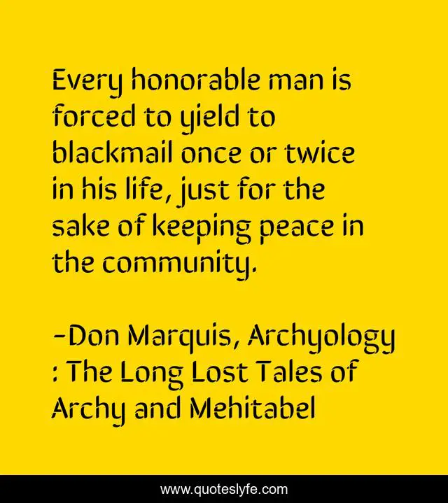 This page presents the quote "Every honorable man is forced to yield to blackmail once or twice in his life, just for the sake of keeping peace in the community.". Author of this quote is Don Marquis, Archyology : The Long Lost Tales of Archy and Mehitabel. This quote is about peace, blackmail,.