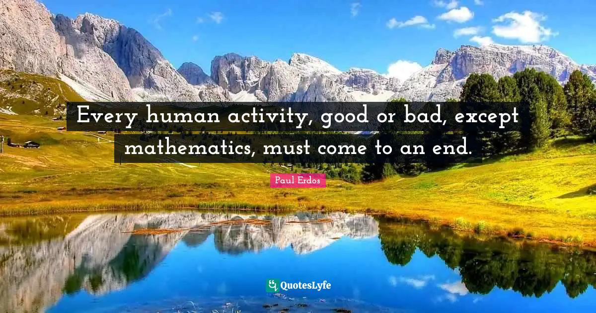 This page presents the quote "Every human activity, good or bad, except mathematics, must come to an end.". Author of this quote is Paul Erdos. This quote is about mathematics, education, human activity, science,.