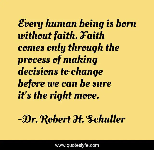 This page presents the quote "Every human being is born without faith. Faith comes only through the process of making decisions to change before we can be sure it's the right move.". Author of this quote is Dr. Robert H. Schuller. This quote is about faith, unity,.