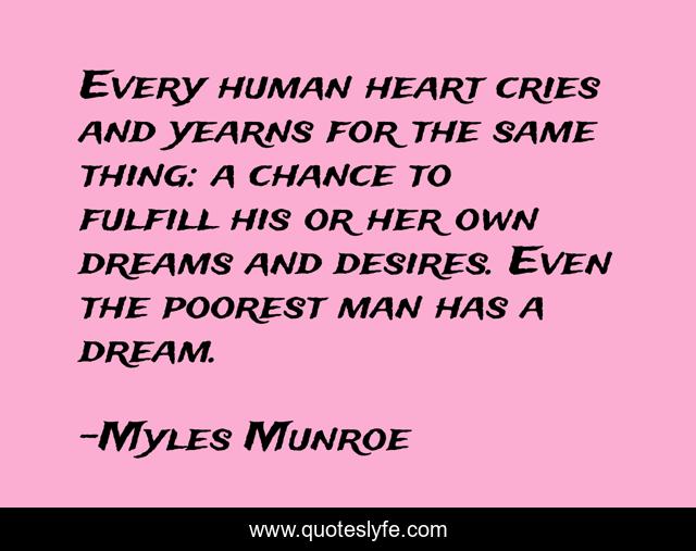 This page presents the quote "Every human heart cries and yearns for the same thing: a chance to fulfill his or her own dreams and desires. Even the poorest man has a dream.". Author of this quote is Myles Munroe. This quote is about heart, chance, man,.