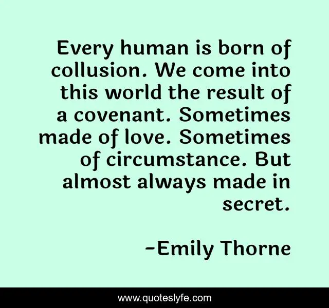 This page presents the quote "Every human is born of collusion. We come into this world the result of a covenant. Sometimes made of love. Sometimes of circumstance. But almost always made in secret.". Author of this quote is Emily Thorne. This quote is about covenant, revenge-tv-series, love, circumstance, collusion, secret, affection,.