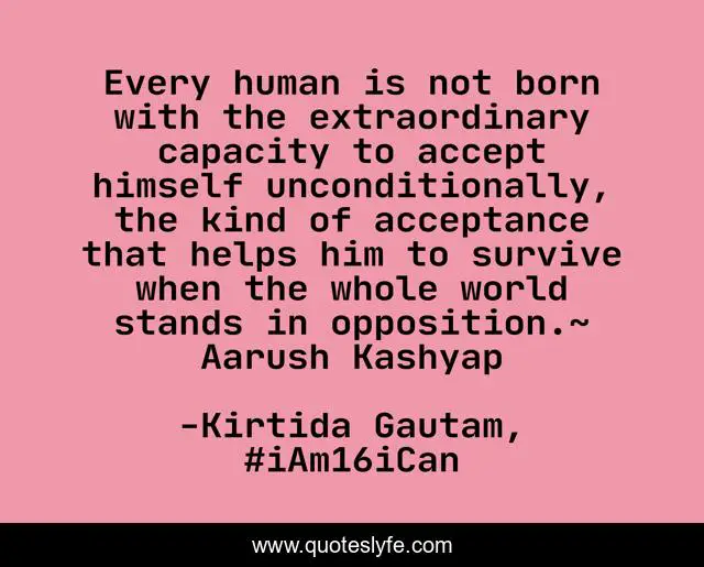 This page presents the quote "Every human is not born with the extraordinary capacity to accept himself unconditionally, the kind of acceptance that helps him to survive when the whole world stands in opposition.~ Aarush Kashyap". Author of this quote is Kirtida Gautam, #iAm16iCan. This quote is about aarush-kashyap, acceptance, love, teenagers, affection,.