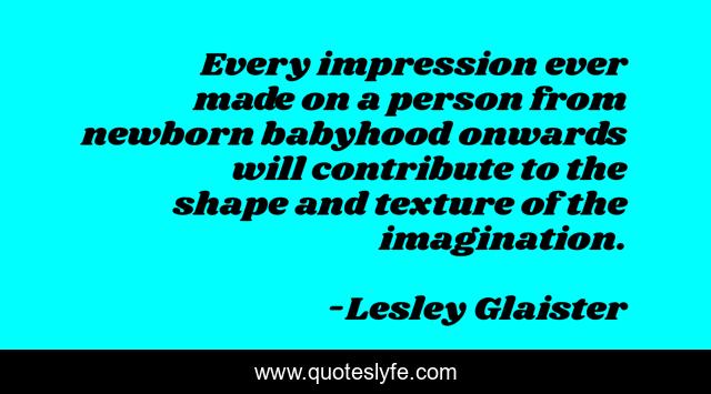 This page presents the quote "Every impression ever made on a person from newborn babyhood onwards will contribute to the shape and texture of the imagination.". Author of this quote is Lesley Glaister. This quote is about creativity, writing, imagination, life-lessons, memory, impressions,.
