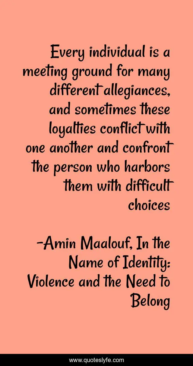 This page presents the quote "Every individual is a meeting ground for many different allegiances, and sometimes these loyalties conflict with one another and confront the person who harbors them with difficult choices". Author of this quote is Amin Maalouf, In the Name of Identity: Violence and the Need to Belong. .