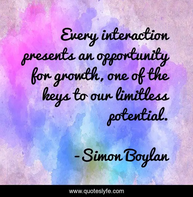 This page presents the quote "Every interaction presents an opportunity for growth, one of the keys to our limitless potential.". Author of this quote is Simon Boylan. This quote is about enthusiasm, growth, potential, inspirational, inspiration,.