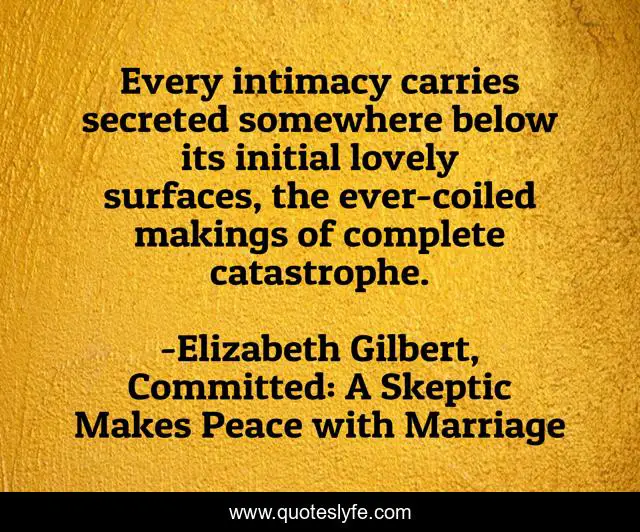 This page presents the quote "Every intimacy carries secreted somewhere below its initial lovely surfaces, the ever-coiled makings of complete catastrophe.". Author of this quote is Elizabeth Gilbert, Committed: A Skeptic Makes Peace with Marriage. This quote is about intimacy, commitment,.