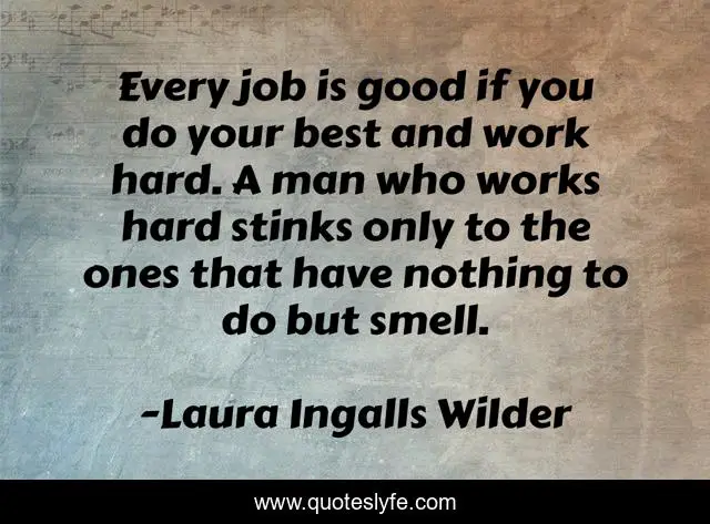 This page presents the quote "Every job is good if you do your best and work hard. A man who works hard stinks only to the ones that have nothing to do but smell.". Author of this quote is Laura Ingalls Wilder. This quote is about work, good, work hard,.