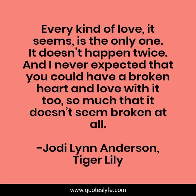 This page presents the quote "Every kind of love, it seems, is the only one. It doesn’t happen twice. And I never expected that you could have a broken heart and love with it too, so much that it doesn’t seem broken at all.". Author of this quote is Jodi Lynn Anderson, Tiger Lily. This quote is about heartbreak, love, first-love, affection,.
