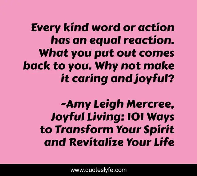 This page presents the quote "Every kind word or action has an equal reaction. What you put out comes back to you. Why not make it caring and joyful?". Author of this quote is Amy Leigh Mercree, Joyful Living: 101 Ways to Transform Your Spirit and Revitalize Your Life. This quote is about life, quotes-de-la-vida, amy-leigh-mercree, be-the-change, quote-of-the-day, joyful-living, quotes-tumblr, joyful-living-101, inspirational,.
