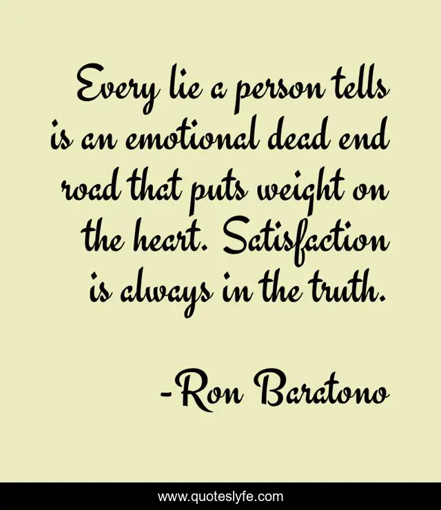 This page presents the quote "Every lie a person tells is an emotional dead end road that puts weight on the heart. Satisfaction is always in the truth.". Author of this quote is Ron Baratono. This quote is about satisfaction, emotional, truth, lie,.