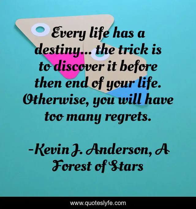 This page presents the quote "Every life has a destiny... the trick is to discover it before then end of your life. Otherwise, you will have too many regrets.". Author of this quote is Kevin J. Anderson, A Forest of Stars. This quote is about religion, life, philosophy, kevin-j-anderson, wisdom,.