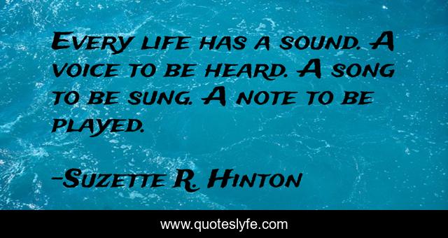This page presents the quote "Every life has a sound. A voice to be heard. A song to be sung. A note to be played.". Author of this quote is Suzette R. Hinton. This quote is about inspirational-life, life,.