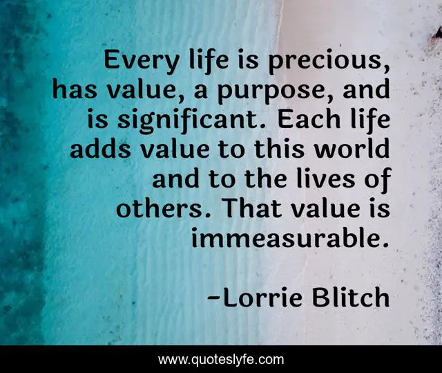This page presents the quote "Every life is precious, has value, a purpose, and is significant. Each life adds value to this world and to the lives of others. That value is immeasurable.". Author of this quote is Lorrie Blitch. This quote is about life, value,.