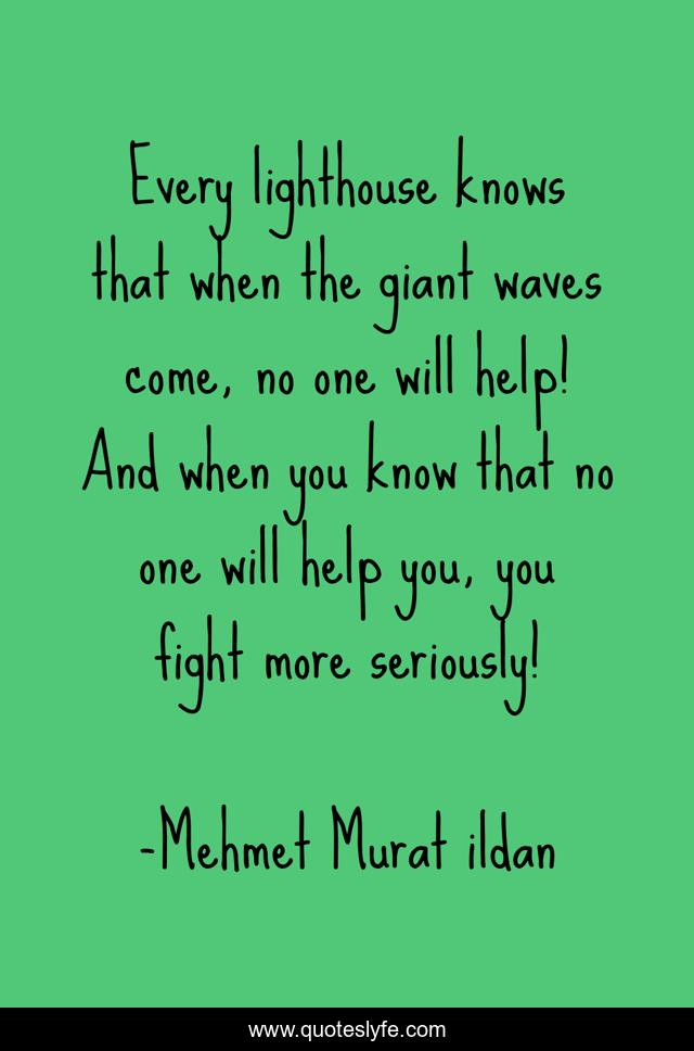 This page presents the quote "Every lighthouse knows that when the giant waves come, no one will help! And when you know that no one will help you, you fight more seriously!". Author of this quote is Mehmet Murat ildan. This quote is about giant, help, murat-ildan, lighthouse, fight, waves,.