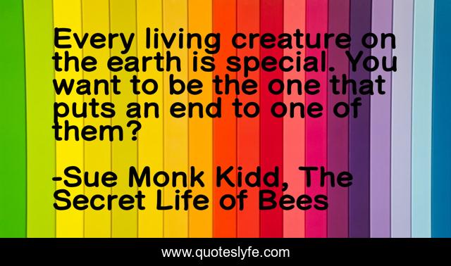 This page presents the quote "Every living creature on the earth is special. You want to be the one that puts an end to one of them?". Author of this quote is Sue Monk Kidd, The Secret Life of Bees. This quote is about animals, morals,.