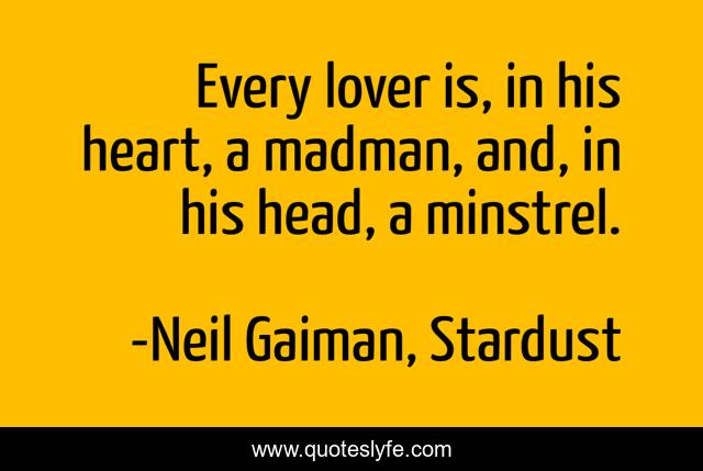 This page presents the quote "Every lover is, in his heart, a madman, and, in his head, a minstrel.". Author of this quote is Neil Gaiman, Stardust. This quote is about heart, madman, minstrel, lover,.