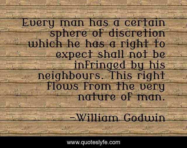 This page presents the quote "Every man has a certain sphere of discretion which he has a right to expect shall not be infringed by his neighbours. This right flows from the very nature of man.". Author of this quote is William Godwin. This quote is about right, expect, man,.