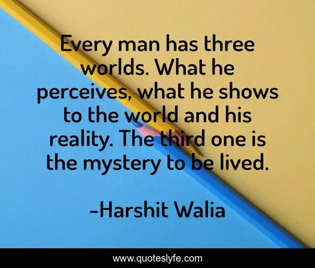 This page presents the quote "Every man has three worlds. What he perceives, what he shows to the world and his reality. The third one is the mystery to be lived.". Author of this quote is Harshit Walia. This quote is about spiritual, show-off, deception, every-man, reality, perception, philosophy,.