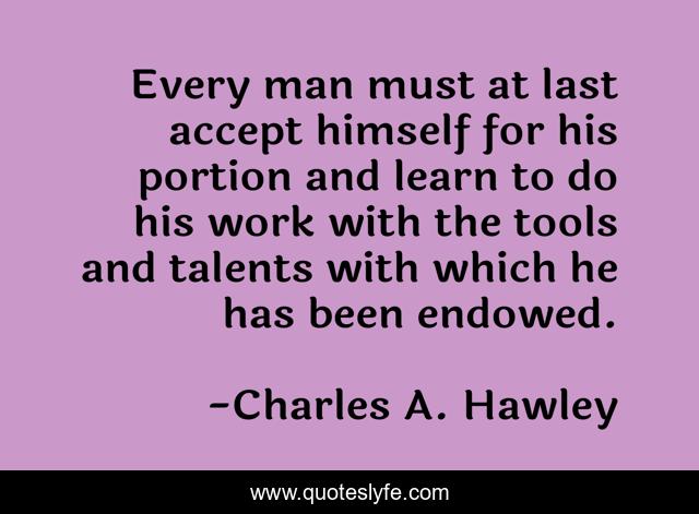 This page presents the quote "Every man must at last accept himself for his portion and learn to do his work with the tools and talents with which he has been endowed.". Author of this quote is Charles A. Hawley. This quote is about self, acceptance,.